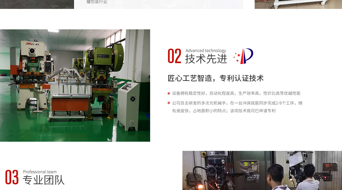 罐身自動(dòng)扣骨機(jī)生產(chǎn):茶葉罐/酒罐/化妝品罐/內(nèi)衣罐等等. 其中多次元機(jī)械手專為兩片盒的生產(chǎn)和三片罐的蓋、底、蓋圈、拍底蓋等的生產(chǎn)而設(shè)計(jì),...